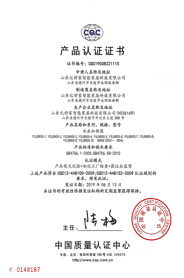 水床加熱器CQC產品認證證書
